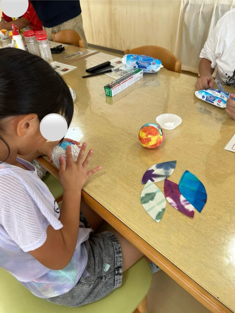 次は丸くした形のものをアルミホイルで包み、小原和紙を貼っていきます。子ども達は自分の好きな色の和紙を選んで丁寧に貼っていました。小原和紙は、とても素敵な色・模様で温かみのあるものでした。