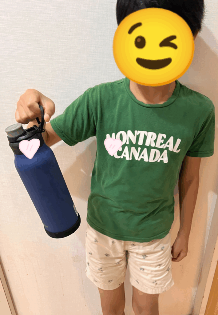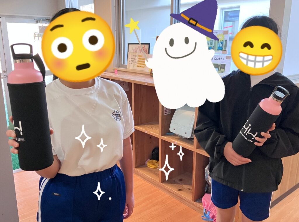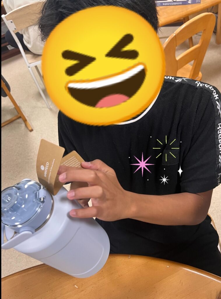 涙マークの理由は、私たちが希望させていただいたものだけでなく【保湿もできて、水、お茶以外も入れることができる水筒を】と子どもたちのために更にプラスで寄贈いただきました。
