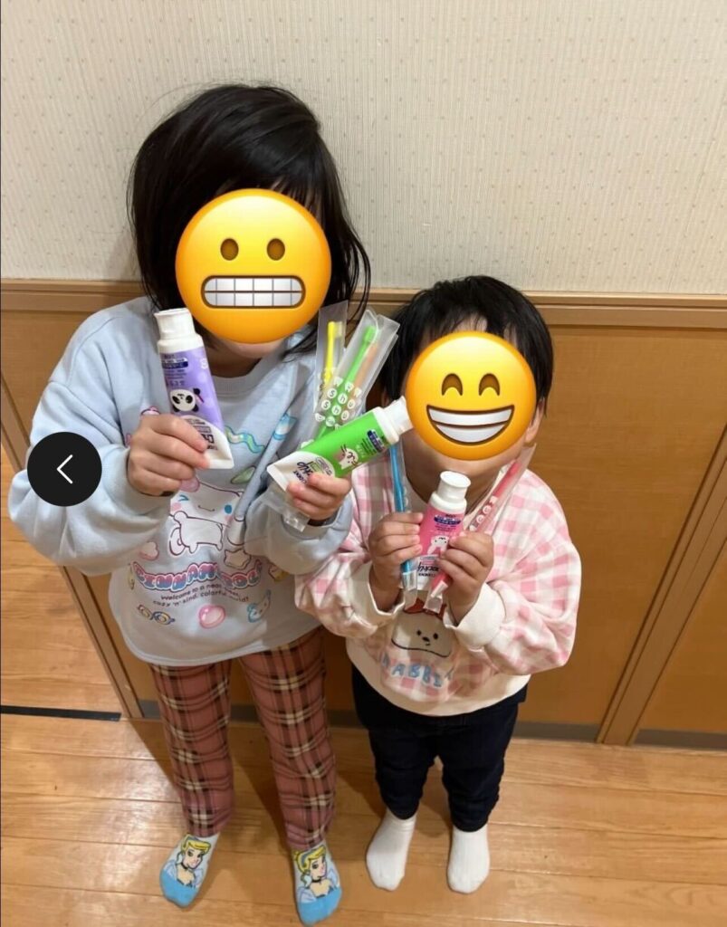 HAL歯科医院様より沢山の歯ブラシ・歯磨き粉をいただきました。毎日、使うものなので大変ありがたいです。歯ブラシは5色の色があり、歯磨き粉では幼児用はリンゴ🍎・イチゴ🍓・グレープ🍇・ピーチ🍑・バナナ🍌とあり、幼児さんは何味にするのか選ぶのも楽しみです。虫歯ができないように毎日頑張って磨きます。
