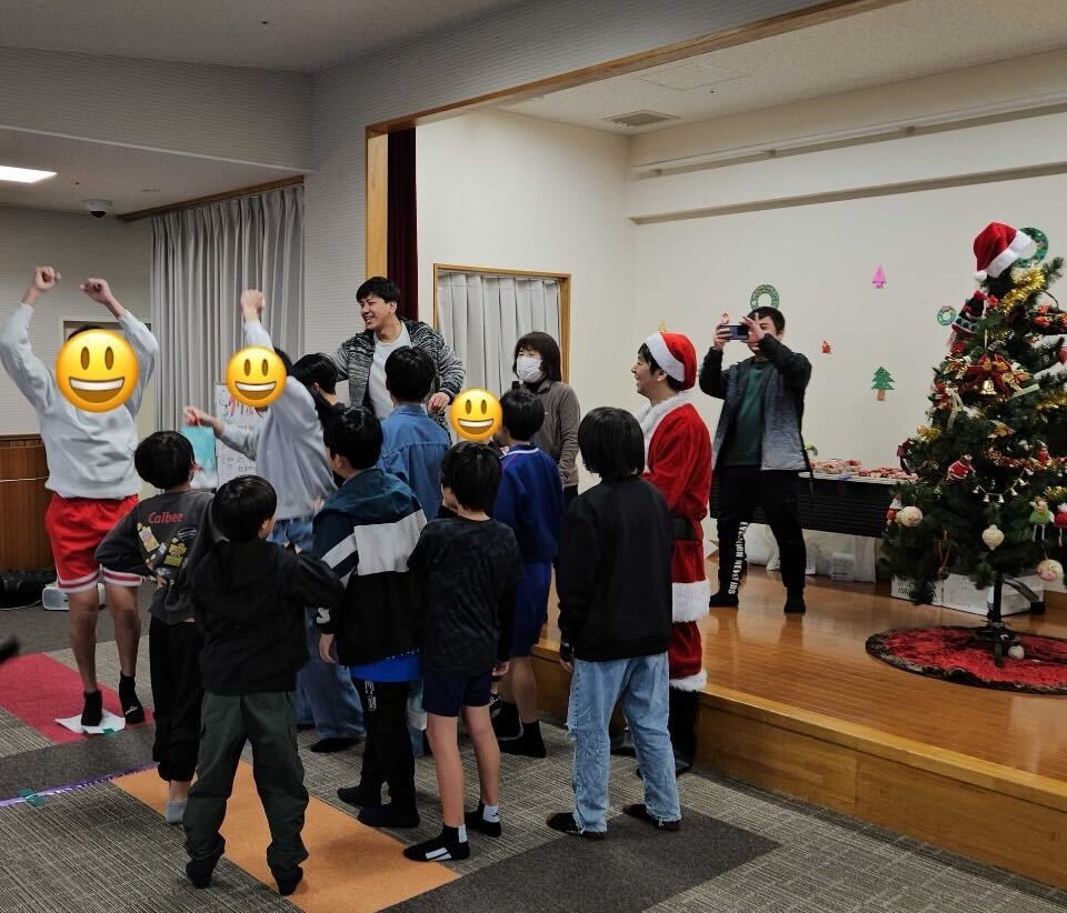 学童ホームの子ども達はサンタクロースさんの来園に大盛り上がり。「やったー!」と腕を上げて大喜びしていました。
