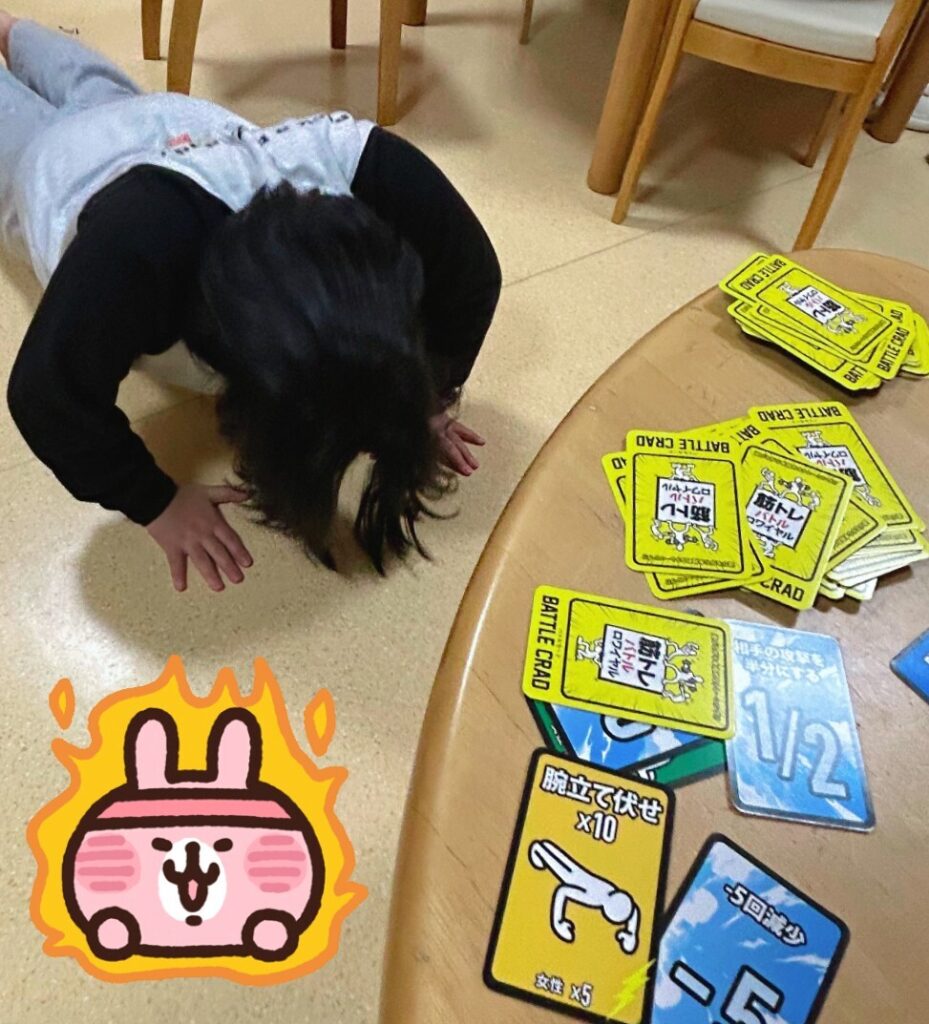 子どもたちは、みんなで遊べるゲームがしたい!!これがいいと「筋トレバトルロワイアル」というカードゲーム他・バトミントンセットをいただきました✨