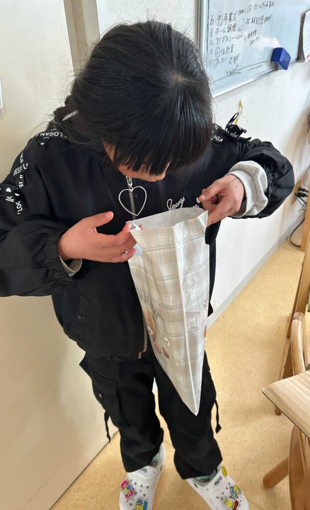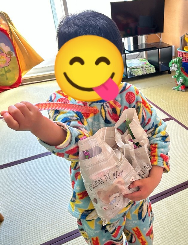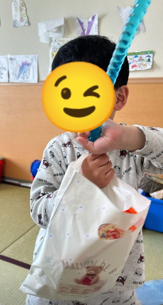 Mちゃんは、「え、これ全部いいの??」と袋の中を見てとても喜んでいました。